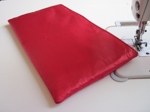 Łączymy warstwy szpilkami wzdłuż węższych krawędzi prostokąta, a następnie zszywamy po obydwu stronach ok. pół cm od krawędzi: